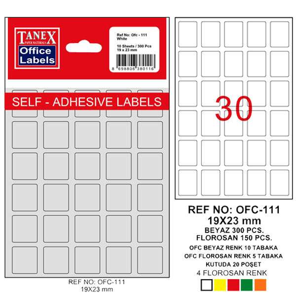 Tanex Ofis Etiketi Poşetli 19x23 MM Beyaz OFC-111 (10 lu paket)